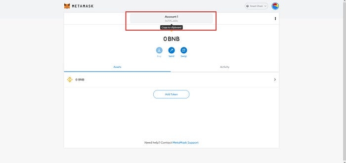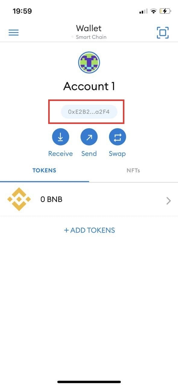 To copy the public address of your wallet in the Binance Smart Chain click on or tap on your address.